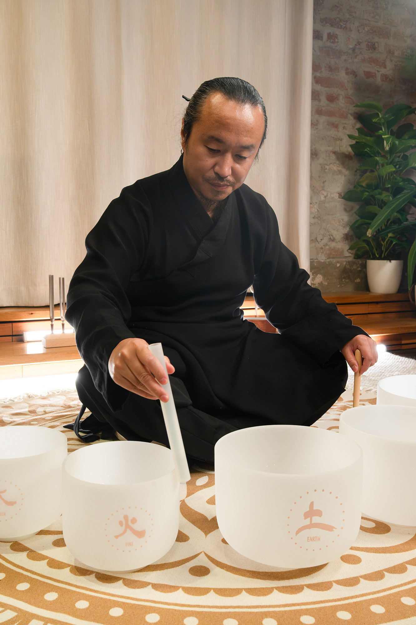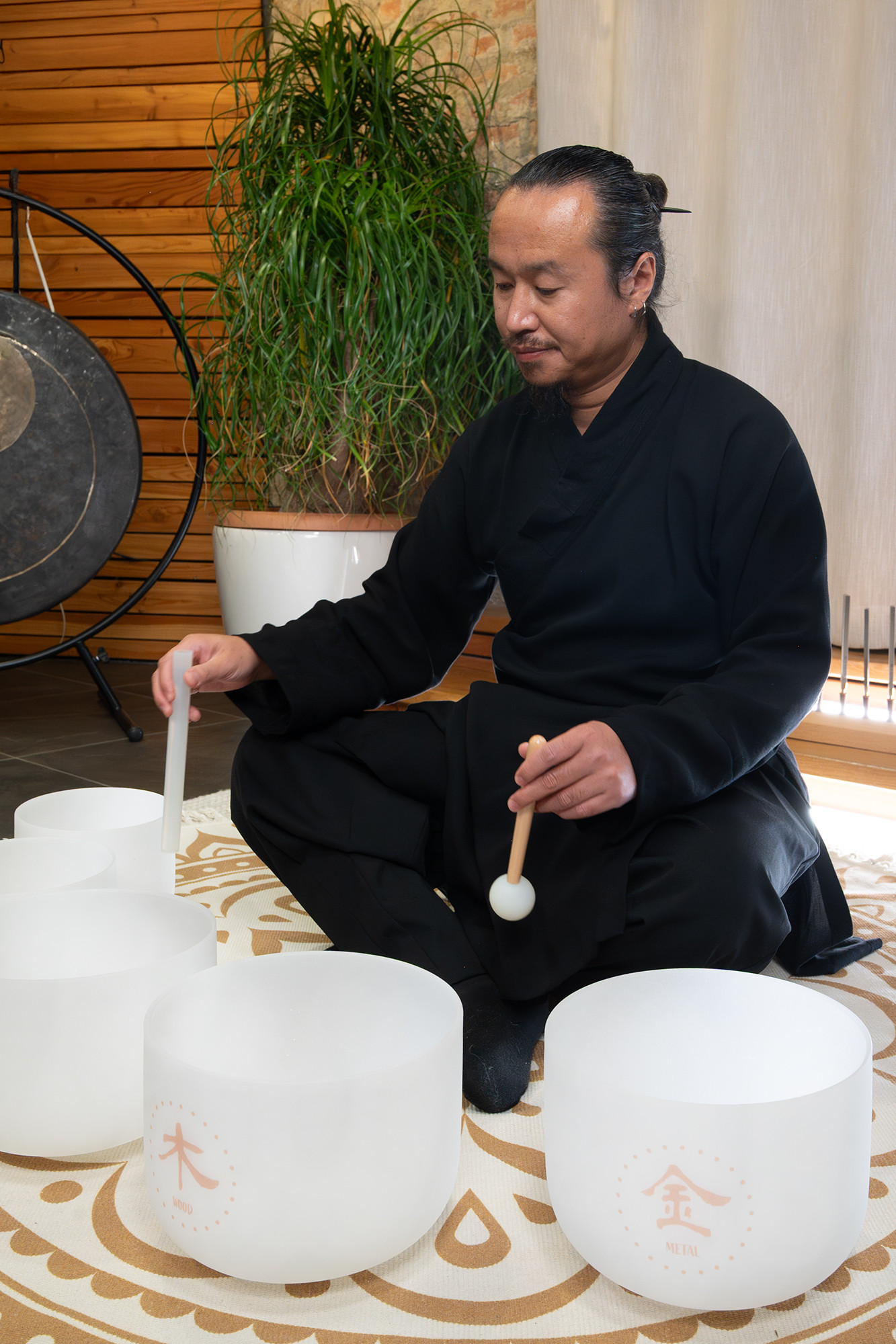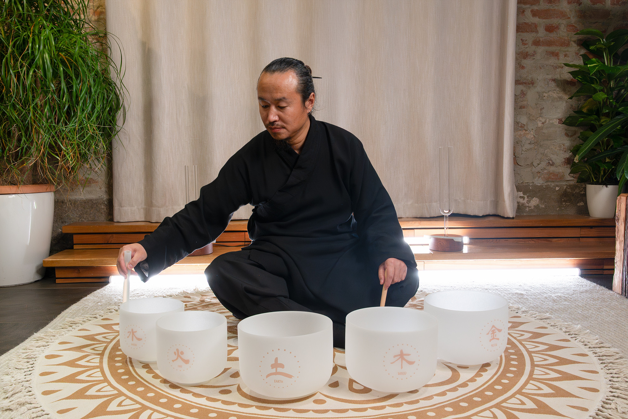 Stimmung: Holz 324 Hz, ~E4, Feuer 384 Hz, ~G4, Erde 256 Hz, ~C4, Metall 288 Hz, ~D4, Wasser 432 Hz, ~A4